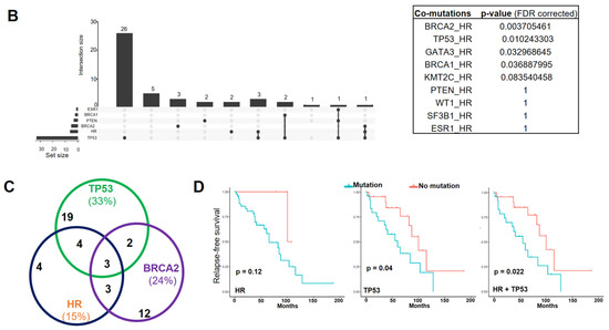 HR gene mutations are correlated with an increased recurrence rate in human BC. (A) Oncoplot showing mutations identified via targeted sequencing in the coding regions of HR and other key genes known to contribute to BC pathogenesis in 85 BC samples and 6 BC cell lines. X-axis represents each individual patient. Y-axis depicts the number of variants identified in all 11 genes in each patient. (B) An UpSet plot showing the co-occurrence of mutations among selected genes within each sample. Intersection size describes the number of samples that have at least one mutation in each of the genes with a dot below them. Multiple Fisher exact tests were performed to determine the significance of each pair of the co-occurring mutations among the samples. Based on the FDR-corrected p-values, HR and BRCA2 had a significant co-mutation rate among samples. (C) Venn diagram showing the co-mutation rate of HR, TP53, and BRCA2 among samples. (D) Tumor recurrence and patient survival analysis based on HR and TP53 mutations or co-mutations.