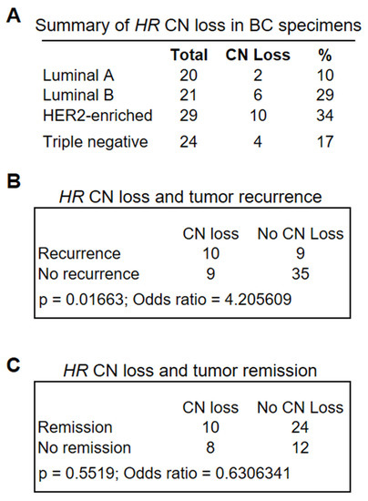 (A) Frequency of HR CN loss in BC specimens as determined via ddPCR analysis of 94 BC specimens encompassing different BC subtypes. Lum A group had a lower-than-average CN loss (23.4%) across all subtypes (p = 0.0784 based on the proportion Z-test), whereas HER2-enriched subtypes had the greatest average CN loss (p = 0.0794). (B,C) Fisher’s exact tests showed a significant association between HR CN loss and tumor recurrence (p = 0.01663 (B)), but not tumor remission (C).