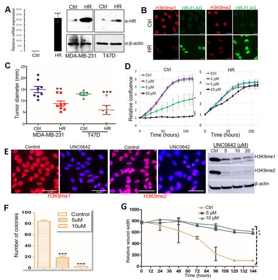 HR regulates breast tumor progression through H3K9 methylation. (A) HR mRNA and protein expression in MDA-MB-231 and T47D cells determined by real-time PCR and Western blot (File S1). (B) Relative levels of mono-methylated H3K9 (H3K9me1) and di-methylated (H3K9me2) in MDA-MB-231 cells. MDA-MB-231 cells were transduced with control lentivirus (Ctrl) or lentivirus-HR (HR), followed by immunofluorescence staining with anti-H3K9me1 (red), Flag (green), and counter staining with DAPI (blue). Scale bar: 20 μm. (C) Tumor growth after MDA-MB-231 and T47D cells transduced with control lentivirus (Ctrl) and lentivirus-HR (HR) were inoculated into the fat pads in NOD SCID mice. (D) IncuCyte ZOOM time-lapse imaging analysis for MDA-MB-231 cell proliferation after treatment with DMSO (Ctrl) or UNC0642 (1, 5, or 10 μM). Data are presented as the mean ± standard deviation (n = 3). (E) Detection of changes in H3K9me1 and H3K9me2 in MDA-MB-231 cells after treatment with DMSO (control) or UNC0642 by IF and Western blotting (File S1). For IF experiments, cells were stained with anti-H3K9me1 or anti-H3K9me2 (red) and counter stained with DAPI (blue). Scale bar: 50 μm. (F) Colonies formed by MDA-MB-231 cells after treatment with DMSO (control) or UNC0642 (5 or 10 μM). (G) Wound healing of the MDA-MB-231 cell monolayer after treatment with DMSO (Ctrl) or UNC0642 (5 or 10 μM). *: p < 0.05. **: p < 0.01 vs control. ***: p < 0.001 vs control.