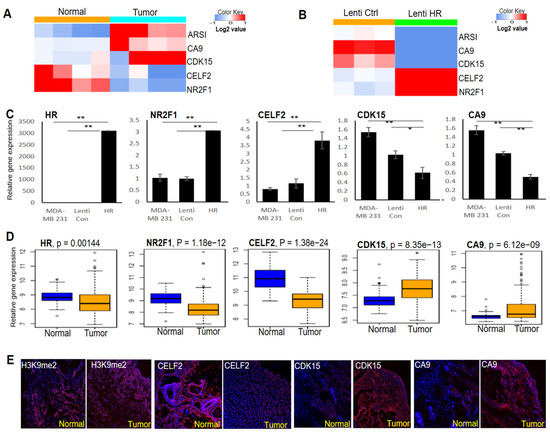 To identify HR-regulated genes in BC cells, we performed RNA-seq to determine differential gene expression between HR-expressing and control MDA-MB-231 cells. Differentially expressed genes between four pairs of HR-deleted breast tumors and matched normal breast tissues were also identified via RNA-seq. Among the top-ranked differentially expressed genes between these two RNA-seq datasets, CELF2 and NR2F1 were consistently decreased in HR-deleted breast tumors (Figure 4A), but upregulated in HR-expressing MDA-MB-231 cells (Figure 4B). In contrast, the expression of CDK15, CA9, and ARSI was elevated in tumors but repressed in HR-expressing MDA-MB-231 cells (Figure 4A,B). As shown in Figure 4C, we validated the differential expression of CELF2, NR2F1, CDK15, and CA9 between HR-expressing and control MDA-MB-231 cells by qRT-PCR.
