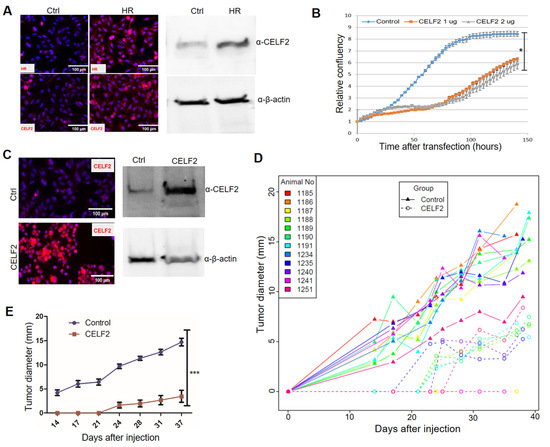 CELF2 suppresses BC cell proliferation and tumor growth. (A) Upregulation of CELF2 protein expression in HR-reconstituted cells. CELF2 protein expression in HR-reconstituted (HR) MDA-MB-231 cells was examined via IF (left) or Western blotting (File S1) (right) using a CELF2 antibody (scale bar: 50 μm). β-Actin was used as a loading control. (B) Proliferation of MDA-MB-231 cells transfected with control or CELF2-expressing plasmids (1 and 2 μg). Cell proliferation was expressed as the relative confluency by using the Incucyte system. *: p < 0.05 vs the control. (C) Confirmation of CELF2 overexpression in a selected CELF2-transfected MDA-MB-231 cell line via IF (left) or Western blotting (File S1) (right) using the CELF2 antibody. (D,E) In vivo tumor growth curves of control or CELF2-overexpressing (CELF2) MDA-MB-231 cells following injection into SCID mouse fat pads. Tumor sizes measured from each mouse are illustrated with a solid (control) or dotted (CELF2 overexpression) line in the scatter plot (D). Average tumor sizes from control or CELF2 overexpression groups are illustrated in (E). ***: p < 0.001 vs control.