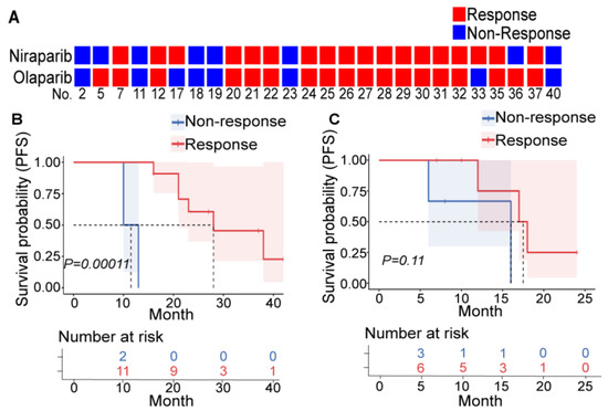 PDXs can reflect PARPi efficacy. (A) Results of the niraparib (upper row) and olaparib (lower row) susceptibility tests in PDXs derived from 26 patients. Each square represents a response to a drug (red: nonresponder; blue: responder), and each column represents a patient (the patient number is at the bottom). Patients who were treated with PARPis as first-line (B) or second-line (C) maintenance therapy were divided into the responder (red) and nonresponder (blue) groups according to the PDX drug sensitivity test, and the differences in PFS between these two groups were compared. The upper picture depicts the Kaplan–Meier curve and log-rank value between the responder and nonresponder groups. The lower table shows the number of patients who did not reach the endpoint at the corresponding time points in each group.