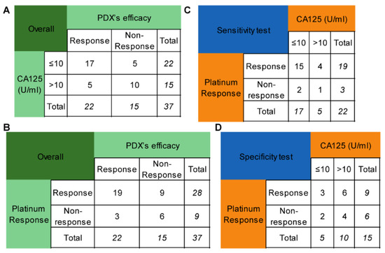 Platinum sensitivity is the clinical indicator for niraparib when it is used as maintenance therapy. However, it takes at least six months to determine the platinum response in naive patients, which can delay the administration. The degree of CA125 reduction during chemotherapy may partly reflect the sensitivity to platinum-based chemotherapy. As a result, this study investigated whether the lowest CA125 level (truncated at 10 U/mL) during chemotherapy could replace platinum sensitivity as a predictor of PARPi efficacy. Seventeen out of twenty-two patients with CA125 levels of no more than 10 U/mL were platinum-sensitive, while 5 out of 15 patients with CA125 levels less than 10 U/mL were platinum-resistant. The sensitivity and specificity of CA125 for predicting the efficacy of PARPis were 77.27% and 66.67% (Figure 3A), respectively, while those of platinum sensitivity were 86.36% and 40.00% (Figure 3B), respectively. These values were not significantly different (p = 0.687, p = 0.289, respectively) (Figure 3C,D).