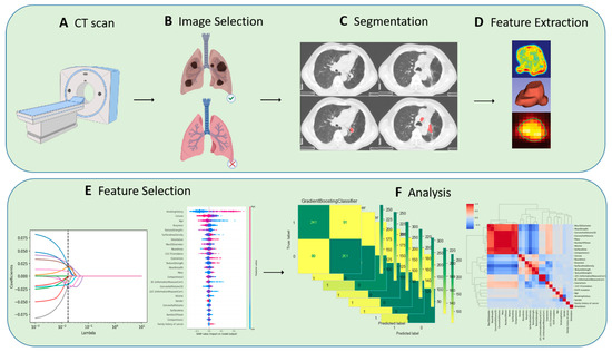 The image analysis platform 3D Slicer (version 4.11, https://www.slicer.org/, accessed on 15 August 2021) was used in this study. The ROI segmentation was performed by two radiologists from the thoracic and abdominal groups, both with more than five years of relevant experience. The segmentation method was semi-automated with the following workflow: pre-processing, semi-automatic correction of lung boundaries, solid and ground glass shadow boundary processing, manual refinement editing, etc. Images segmented by two of the radiologic imaging specialists were selected for intraclass correlation coefficient (ICC) consistency review, and discrepancies were resolved through discussion until consensus was reached. The overview of the radiomics workflow is illustrated in Figure 1.