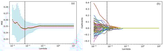 the LASSO algorithm for features selection. (a) The mean square error path using ten-fold cross-validation. (b) LASSO coefficient profile of 622 features, where 31 features with non-zero coefficients were selected.