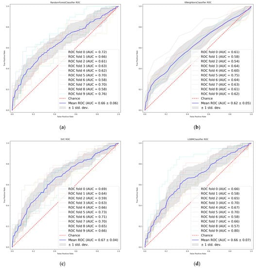 Receiver operating characteristics (ROC) curves of LASSO features. (a) Random Forest. (b) K-nearest neighbor. (c) Support vector machine. (d) Light Gradient boosting.