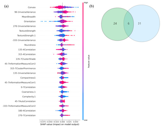 (a) The Shapely-value ranking of every single feature. (b) Six common radiomics features between PCA and LASSO features, respectively.