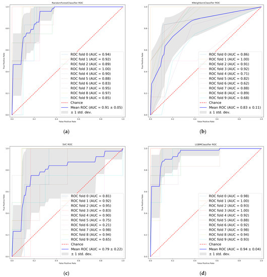 Receiver operating characteristics (ROC) curves when using the combined features. (a) Random Forest. (b) K-nearest neighbor. (c) Support vector machine. (d) Light Gradient boosting.