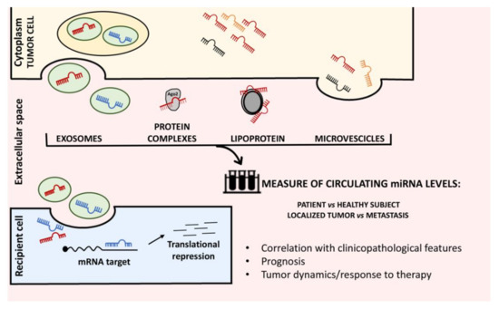 miRNAs release in the extracellular space. miRNAs can be released in the extracellular space through different ways, such as exosomes, by forming protein or lipoprotein complexes, and microvesicles. Once internalized in the recipient cell, miRNAs can act on the target mRNAs by achieving their translational repression. Circulating miRNA levels from blood samples showed differences between sarcoma patients and healthy subjects and between patients with localized tumor or metastatic disease. Circulating miRNA levels may correlate with the clinicopathological features of patients, with their prognosis and may change in response to therapeutic treatments.