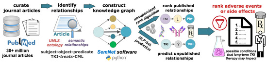 Two types of knowledge graph text mining were performed: the standard unsupervised rank aggregation algorithm of SemNet to assess published relationships in the knowledge graph [23] and a link prediction module to assess predicted unpublished relationships [30]. Link prediction has been used by other studies as well to predict novel links of importance from biomedical knowledge graphs [31,32,33]. Hub node network analysis was developed and implemented to extend the coverage of link prediction for this study. Collectively, relationships predicted as important suggest possible conditions that should be monitored during TKI therapy. Figure 1 illustrates the knowledge graph pipeline utilized in this work.
