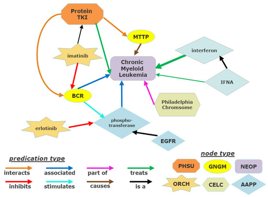 Examination of existing published nodes relating CML and tyrosine kinase was performed in SemNet. SemNet is a semantic inference network and biomedical concept knowledge graph that uses unsupervised ranking algorithms to reveal hidden connections from PubMed’s nearly 30 million indexed abstracts [22,23]. A user can run a simulation for a particular node of interest, which is specified as the “target node”, for which SemNet will search the knowledge graph and return a list of “source nodes” that are connected to the target node(s). Each connection has both a predication type that represents the association between the two nodes, as well as a magnitude that represents the prevalence of the connection within the PubMed literature. A highly pruned subgraph of the larger knowledge graph utilized is shown as an example in Figure 2. Each node has a particular node type to help the user methodically filter for desired source nodes. For instance, if a user wanted to examine all the published genetic factors involved in chronic myeloid leukemia, they could run a simulation with a target node of “chronic myeloid leukemia” and filter the resulting source nodes for the “gene or genome” (GNGM) node type. Node names and node types follow the Unified Medical Language System (UMLS) ontology.