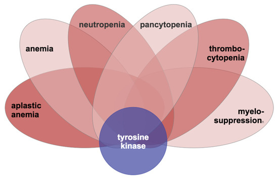 K-means clustering of CML-specific TKI literature and cross-domain text mining with tyrosine kinase (Figure 4 and Figure 7) found myelosuppressive hematological conditions were among those most frequently cited in CML. Hematological adverse events (namely anemia, neutropenia, thrombocytopenia) were found within each TKI-specific cluster (imatinib, dasatinib, bosutinib, nilotinib, ponatinib). This is not unexpected given the mechanism of action of TKIs, which stop proliferation of Philadelphia chromosome-positive white blood cells. Anemia can be worsened or complicated by iron deficiency, which is the number two predicted adverse event. The persistence of a hematological AE or the deficiency of more than one blood cell type could suggest hypocellular bone marrow, which may occur with myelosuppression. Hypocellular bone marrow was one of the nodes that was highly ranked in the hematological conditions foci.