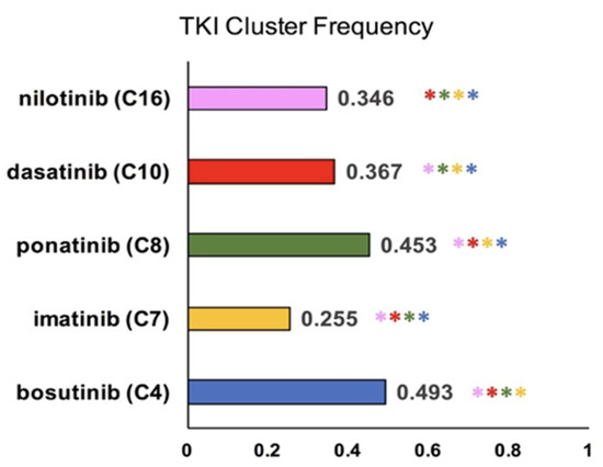 Mapping specific TKIs to AEs. The color of each bar corresponds to the color of the cluster in the previous scatter plot (Figure 4). The frequency of occurrence of each TKI in its related cluster is printed next to each bar. A chi-squared test with Bonferroni correction found a significant difference in fold change. Fold change refers to the difference in frequency of a term within a cluster when compared to its frequency within the corpus as a whole. Color of the asterisk(s) illustrates a significant difference between the cluster depicted in the bar and the cluster depicted by the color of the asterisk. Significance is denoted by family-wise alpha of 0.05.