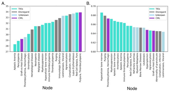Top twenty Unified Medical Language System (UMLS) nodes related to TKIs and CML. SemNet queried a knowledge graph containing 30+ million journal articles. All nodes shown are of UMLS node type “disease or syndrome” (DSYN). CML and tyrosine kinase were set as SemNet target nodes. Aqua bars correspond to conditions observed in patients on TKIs; purple bars correspond to conditions observed in CML patients on no treatment or on a non-TKI treatment; light blue bars correspond to conditions where no established relationship to CML was found; gray bars correspond to disregarded conditions that were too broad to be informative. (A) The top 20 most relevant UMLS node relationships to CML or TKIs based on HeteSim feature relevance. Here, a lower HeteSim score (y-axis) correlates to a stronger relationship to the target; thus, from left to right, the strengths of the relationships to the target(s) decrease. (B) The top 20 relevant UMLS node relationship to CML or TKIs based on novelty score feature relevance. A higher novelty score correlates to a potentially stronger novel connection (meaning fewer studies have published the relationship, although the algorithm still considers the relationship to be relevant to the target nodes). Novelty decreases from left to right.