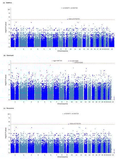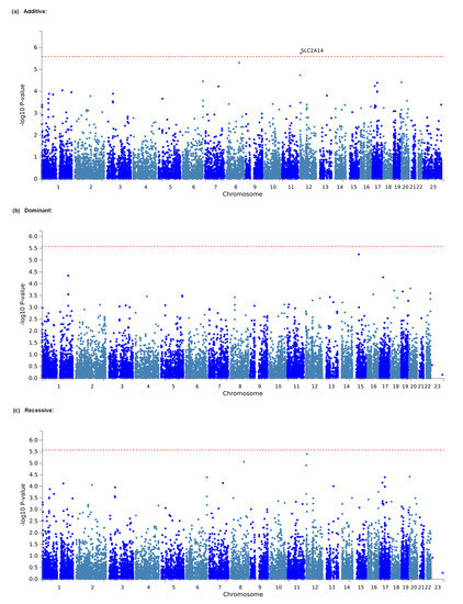 Manhattan plot of GWAS outcomes. (a) Analytical plot in the additive model. (b) Analytical plot in the dominant model. (c) Analytical plot in the recessive model. The dashed red line shows the significant association threshold.