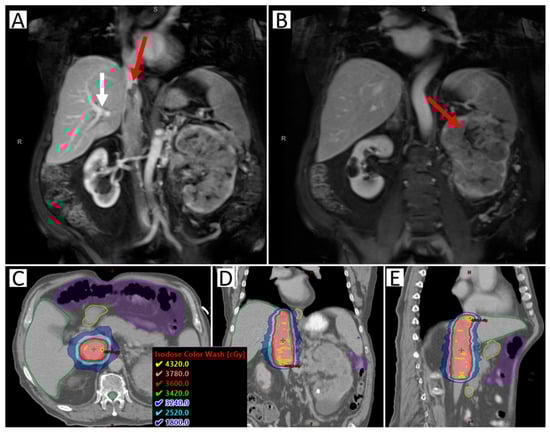 Images of a sample case of a patient with RCC IVC tumor thrombus level III, making resection not possible. The patient was treated with SAbR 36 Gy/3 fractions. (A) Coronal abdominal MR with contrast; red arrow highlighting the superior extent of the tumor thrombus; white arrow highlighting tumor thrombus extension beyond the branching of the hepatic artery (blockage the leads to Budd-Chiari Syndrome, making surgery more complicated). (B) Coronal abdominal MR with contrast; right arrow highlighting the large left primary kidney tumor. (C–E) Axial, coronal, and sagittal CT with radiation dose distribution shown. Nearby organ at risk highlighted include liver (green), duodenum (yellow), bowel space (purple), and spinal cord (green).
