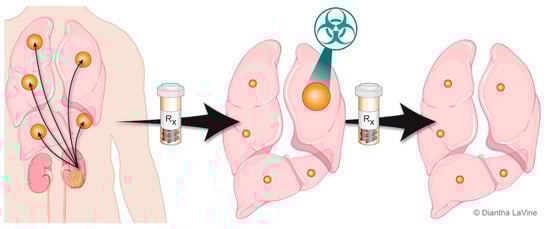 Individuals with metastatic RCC can develop disease progression at only a few select sites of disease, deemed oligoprogressive (Figure 2). To date, there has been limited research on patterns of progression. For example, conventionally used criteria for response assessment in clinical trials, such as Response Evaluation Criteria in Solid Tumors (RECIST) criteria, do not distinguish patterns of progression. The current approach to progression in clinical practice is to switch systemic therapy, even if progression is limited to a few sites. This is also an approach for patients who are otherwise tolerating the ongoing systemic therapy well. There are likely different modes of progression that reflect a spectrum of disease responsiveness to therapy and cancer biology. One hypothesis to explain limited disease progression while on systemic therapy is mutational heterogeneity and clonally propagated branched evolution that fosters tumor adaptation and therapeutic failure through Darwinian selection [50,51,52]. This spectrum of disease progression may thus be optimally managed with a strategy different from the singular standard approach to change systemic therapy.