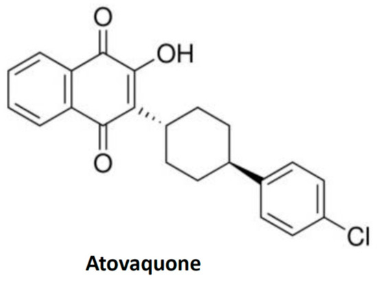 Atovaquone is a chemical compound that belongs to the class of naphthoquinone analogues of ubiquinone. In the US, it is available as an oral suspension, under the brand name Mepron, and it is also available as an atovaquone suspension, which is an FDA-approved drug used for the treatment and prevention of malaria [48]. Details about its structure and other physical chemistry features have been described previously [49]. Briefly, the structure of atovaquone is depicted in Figure 1 and it is thought to act as a potent and selective OXPHOS (oxidative phosphorylation) inhibitor, by targeting mitochondrial complex III (Figure 2). It is a highly lipophilic compound with a very limited aqueous solubility; moreover, it is protein bound (>99%), but causes no significant displacement of other highly protein-bound drugs. Atovaquone is structurally similar to the inner mitochondrial protein coenzyme Q (also known as ubiquinone), which is an integral component of the electron transport chain in oxidative phosphorylation. Coenzyme Q accepts electrons from dehydrogenase enzymes and passes them to cytochrome bc1 (complex III), which requires the binding of coenzyme Q-complex III at the Qo cytochrome domain. However, atovaquone inhibits this step of electron transport chain [49,50,51]. The consequence of this inhibition is the collapse of mitochondrial membrane potential and thus the rendering of apoptosis [52].