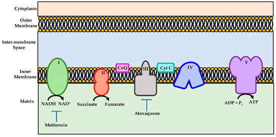 Schematic representations of mitochondrial electron transport chain. Metformin and atovaquone inhibits Complex I and complex III respectively and they are indicated as potential therapeutics importance.