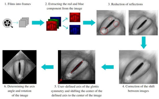 The blue component in the RGB color images was used to reduce glare caused by the light source (steps 2 and 3a). The red component, on the other hand, was used to enhance the difference in the level of brightness between the vocal folds and the glottal area (steps 2 and 3b). Next, image offsets reaching up to a dozen pixels between subsequent images were reduced (step 4). These offsets significantly affected the results of the analysis. They were reduced by correlating every two consecutive images and finding the coordinates for which the best fit between images occurred. The next step was to find in the HSV recordings the image with the largest glottic opening. Once found, the software user marked two points delineating the main axis of the glottal area (step 5) on the image selected. Finally, the inclination of the axis was used as the angle by which the image was rotated to align the axis vertically (step 6).