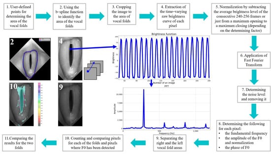 An original and effective approach to the analysis of laryngeal HSV images has been proposed by Japanese authors [,,]. In their method, referred to as laryngotopography, a fast Fourier transform was used to detect the temporal variation in the brightness of different topographic regions in a sequence of laryngeal HSV images. This approach enabled the detection of periodic variations of the glottal area []. The fundamental frequency F0 and phase relations of these movements were determined.