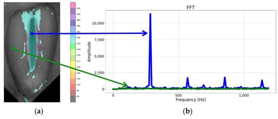 The laryngotopography of the fundamental frequency (a) and FFT plot (b) for two marked points of the LHSV image, the blue plot corresponds to the area of vibration of the vocal folds and the green plot corresponds to the area in which no regular periodic movement was detected. The color on the map was taken from a color palette (shown on the right-hand side of the image) in which different colors were assigned to different frequency ranges.