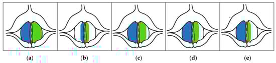 Illustration of the detected different size regions of the vocal folds vibrating at the fundamental frequency indicated by the different values of SAI and the corresponding values of the parameter (approximate values), (a) SAI = 0.0, (b) SAI = 0.0, (c) SAI = 0.25, (d) SAI = 0.5, (e) SAI = 0.75 []. The red dashed line marks the axis of symmetry of the glottis, and the blue and green areas correspond to the detected areas of vibration of the right and left vocal folds, respectively.