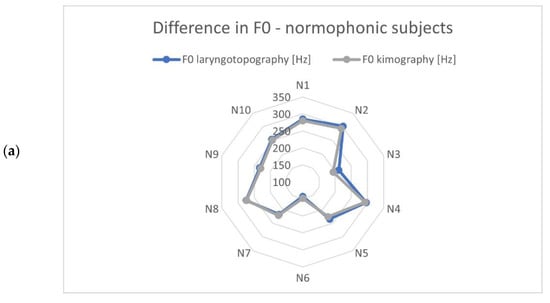 The identified vibration frequencies (using laryngotopography) were compared with the results obtained from the kymographic analysis based on GWW (glottal width waveform) to verify whether the developed algorithm correctly calculated the fundamental frequency from the HSV recordings. The polar plots in Figure 6 show a comparison of the calculated fundamental vibration frequencies for each subject in the examined groups. The maximum difference observed was 20.6 Hz, and the average difference was 6.2 Hz. This was a fairly accurate result given the frequency resolution that can be achieved with the imaging methods compared. Note that the detected fundamental frequencies ranged from 90 Hz to 370 Hz.