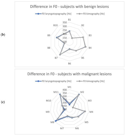 Comparison of the fundamental frequencies obtained from HSV recordings by means of laryngotopography and kymography analyses for each study group: (a) normophonic, (b) benign, and (c) malignant lesions. The scale of the polar diagrams is given in Hz and the codes N1-N10, B-10 and M1-M11 correspond to the normophonic subjects and subjects with benign and malignant lesions, respectively.