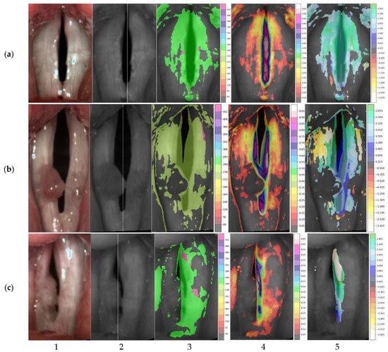Finally, the phase maps represented the phase shifts in the harmonic movements of the different regions of the vocal folds (the fifth column of images in Figure 7). These shifts are given in radians, and different palette colors are assigned to represent these phase shifts. Note that for a normophonic individual (Figure 7a), the phases did not significantly differ (similar palette colors are assigned to the vocal folds), indicating that the vocal folds vibrate in unison. On the contrary, for laryngeal lesions, we observed a different color in the phase maps indicating desynchronization of the vibration of the different regions of the vocal folds.
