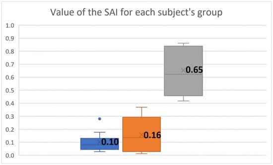 The box-and-whisker plot in Figure 8 shows the distribution of the SAI values for each group of subjects. Benign lesions were characterized by a wider range of values than normophonic cases, indicating that some types of lesions did not affect the regularity of fold vibrations, whereas, for others, substantial asymmetry in the vocal fold vibration patterns was detected. In contrast, for malignant lesions, the SAI values were clustered at higher values, exceeding 0.42, indicating significant asymmetry of vibration between vocal folds. Thus, malignant lesions can be clearly distinguished from normophonic cases and benign lesions based on SAI values.
