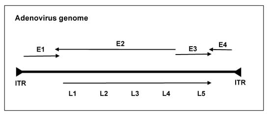 The most studied and widely used oncolytic viruses are adenoviruses. These are non-enveloped double-stranded DNA viruses with linear genomes of ~30–38 kb and a fiber-covered icosahedral protein capsid [5,6]. Most genetically engineered oncolytic adenoviruses are derived from Ad serotype 5 (Ad5) and Ad serotype 2 (Ad2), while over 100 different antigenic serotypes and 7 different species (A–G) have been identified, which infect mammals (genus mastadenoviruses) and birds (genus aviadenoviruses) [7]. The adenoviral replication cycle is broadly divided into two temporal phases with early (E1A, E1B, E2A, E2B, E3, and E4) and late (L1–L5) transcription units, as shown in the figure below; the former is responsible for DNA synthesis and the latter for the structural proteins of the Ad virion [8]. The Ad genome is flanked by inverted terminal repeat (ITR) sequences, which initiate replication (Figure 1).