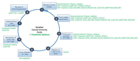 Strong downregulation or absence of the coxsackie and adenovirus receptor (CAR) might instead prompt the use of non-CAR dependent viruses such as AdAPT-039, ONCOS-102, Enadenotucirev (EnAd), NG-350A, NG-641 or LoAd-703. As NG-641 expresses the chemokines CXCL9 and CXCL 10, which mediate immune cell trafficking [65], and LoAd-307 encodes the costimulatory ligands CD40L and 4-1BBL, the use of these viruses may also potentiate steps 4 (NG-641) and 6 and 7 (LoAd-307).