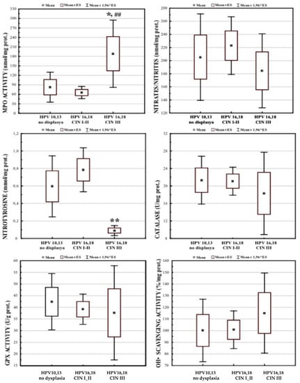 3.1. Local Cervical Oxidative and Nitrosative Markers in HPV-Infected Female Patients at Different Stages of Cervical Carcinogenesis