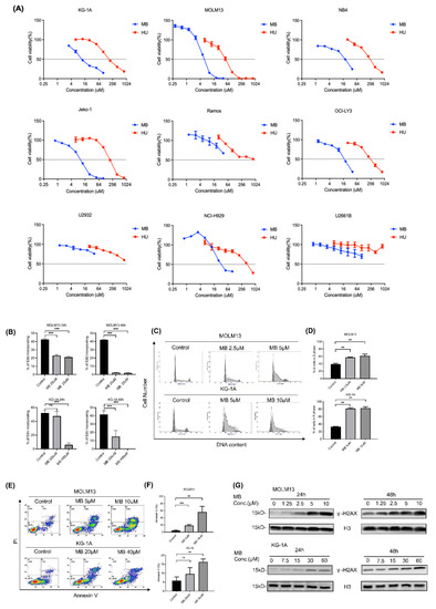 Cell viability assays were performed to test the inhibitory effect of MB on tumour cells, including AML (KG-1A, MOLM13 and NB4), lymphoma (Jeko-1, Ramos, OCI-LY3 and U2932), and multiple myeloma (NCI-H929 and U2661B) cells. As shown in Figure 3A and Table 1, MB exerted a strong, dose-dependent inhibitory effect on the proliferation of treated AML cells, with IC50 values of approximately 6–18 μM. MOLM13 cells were the AML cell line most sensitive to MB, with an IC50 of approximately 6 μM, which was approximately one-tenth the IC50 of HU.