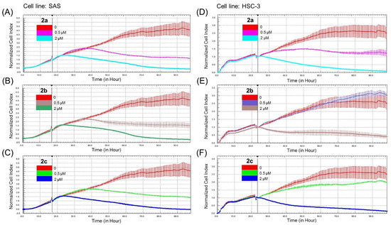 Bis(chloroacetamidino)heteroareneanthraquinones 2a–c attenuate the growth of oral cancer cells. Cell proliferation was dynamically monitored by impedance measurements in SAS (A–C) and HSC-3 (D–F) cells, as described in the Materials and Methods. Shown are normalized cell index values measured. Cells were treated with various concentrations of the studied derivatives 2a–c.