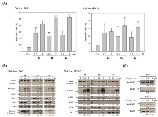 Next, the mechanisms underlying the cytotoxicity of these derivatives were explored, particularly in the p53-independent scenario. This is the first report on the anticancer properties of 2a or 2b, while 2c was previously shown to exert apoptotic activity on bladder cancer cells [40]. Here, we report that all three compounds provoked noticeable increases in the apoptotic populations of both cell lines at 0.5 or 2 μM, as assessed by Annexin V and PI staining (Figure 3A). The apoptotic activity of these derivatives was supported by Western blot analysis, which showed enhancement of caspase 3-directed PARP cleavage, the ADP-ribosylation of PARP, and γH2AX (a DNA damage marker) (Figure 3B). The uncropped blots and molecular weight markers are shown in Supplementary Figure S2. The cytotoxic effect of these derivatives was also evidenced by the downregulation of anti-apoptotic Bcl-2 and c-Flip and a concurrent induction of cleaved caspase 8 in SAS p53-functional cells (Figure 3B). Interestingly, c-Flip downregulation was also observed in HSC-3 p53-mutated cells, suggesting that the studied derivatives could trigger a p53-dependent and/or p53-independent apoptotic mechanism (Figure 3B). The degradation of c-Flip is regulated by SIRT1-mediated Ku70 deacetylation, which leads to cell death [50,51]. Consistent with this, we found that the heteroarene-fused anthraquinone 2c enhanced the acetylated Ku70 levels in both cell lines (Figure 3C). However, SIRT1 expression seemed to be unchanged in cells treated with the derivatives (Figure 3B). The lack of alteration in SIRT1 expression suggested that there may be a different (non-SIRT1) upstream regulator.