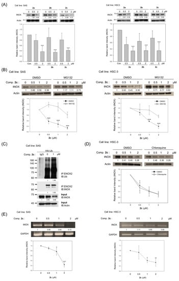 Bis(chloroacetamidino)heteroareneanthraquinones 2a–c downregulate tNOX expression. (A) Bis(chloroacetamidino)heteroareneanthraquinones 2a–c markedly inhibited tNOX protein expression analyzed by Western blotting in SAS and HSC-3 cells. (B) Bis(chloroacetamidino)heteroareneanthraquinones 2c-inhibited tNOX expression was reversed by the proteasome inhibitor, MG132, in SAS and HSC-3 cells. Aliquots of cell lysates were resolved by SDS-PAGE and analyzed by Western blotting. β-actin was detected as an internal control. Representative images are shown. Values (means ± SDs) are from at least three independent experiments (** p < 0.01, *** p < 0.001). (C) The lysates of HA-Ub overexpressing SAS cells were immunoprecipitated with nonimmune IgG or an antibody against ENOX2 (tNOX), and the bound proteins were detected by Western blotting with anti-ubiquitin or anti-tNOX antibodies. The total lysates were also immunoblotting with anti-tNOX or anti-β-actin antibodies. Aliquots of cell lysates were resolved by SDS-PAGE and analyzed by Western blotting. β-actin was detected as an internal control. Representative images are shown. (D) Bis(chloroacetamidino)heteroareneanthraquinones 2c-inhibited tNOX expression was not reversed by the lysosome inhibitor, chloroquine (CQ), in HSC-3 cells. Aliquots of cell lysates were resolved by SDS-PAGE and analyzed by Western blotting. β-actin was detected as an internal control. Representative images are shown. (E) The transcript level of tNOX was reduced by the derivative 2c analyzed by RT-PCR in SAS and HSC-3 cells. Values (means ± SDs) are from at least three independent experiments (* p < 0.05, ** p < 0.01, *** p < 0.001). The uncropped blots and molecular weight markers are shown in Supplementary Figure S3.