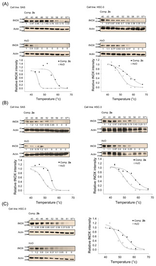 To assess whether tNOX directly and physically binds to the studied derivatives in oral cancer cells, we conducted CETSA. This strategy is based on the concept that a ligand–protein interaction increases the thermal stability of the protein in its native configuration [52,53]. Without direct binding to its ligand, the protein is unfolded; thus, it is promptly precipitated upon heating and exhibits a lower melting temperature (Tm). To calculate Tm values, we first generated CETSA curves in which the intensity of tNOX protein on Western blot was plotted against the temperature. We found that 2c treatment increased Tm from 48.1 °C to 58.2 °C in SAS cells and from 50.3 °C to 56.2 °C in HSC-3 cells; this increase of more than 5 °C in Tm indicates that 2c prompted the thermal stabilization of tNOX through direct binding (Figure 5A). Similarly, Tm values were increased by exposure to derivative 2a in both cell lines, reinforcing the idea that these derivatives have tNOX-binding capacity comparable to that of 2c (Figure 5B). The derivative 2b was also found to target tNOX in HSC-3 cells, as evidenced by Tm increasing by the exposure to derivative 2b (Figure 5C).