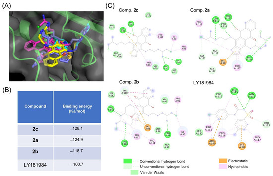 The binding modes of bis(chloroacetamidino)heteroarene-fused anthraquinones 2a–c and LY181984 after docking into the pocket of tNOX. (A) Superimposition of the docked derivative 2c (purple), derivative 2a (yellow), derivative 2b (pink), and LY181984 (cyan). (B) The binding energy for individual compound. (C) Schematic presentations of the putative tNOX binding modes with the studied derivatives 2a–c and LY181984. The key residues surrounding the binding pocket of tNOX were identified through the best docking pose of each compound.