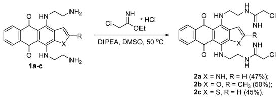Starting anthraquinone derivatives 1a–c, which were annealed with pyrrole, furan, and thiophene, respectively, were synthesized in accordance with our previously reported multistep procedures [21,41,42]. The terminal amino groups of the 4,11-side chains can be converted to acetamidines by reaction with an appropriate iminoester [40,47]. Here, mild heating of amines 1a–c with 2-chloroacetimidate hydrochloride in the presence of Hünig’s base (diisopropylethylamine, DIPEA) was used to generate 4,11-bis(2-(2-chloroacetamidine)ethyl)amine derivatives of heteroarene-fused anthraquinones (2a–c) at reasonable yields (Scheme 1) (Figure 1). Column chromatography followed by treatment with 1N HCl in methanol was used to obtain water-soluble hydrochloride salts of 2a–c. The assigned structures of 2a–c were confirmed by 1H and 13C NMR; the purity of the final samples was >95% (Figure S1 in Supplementary Materials).