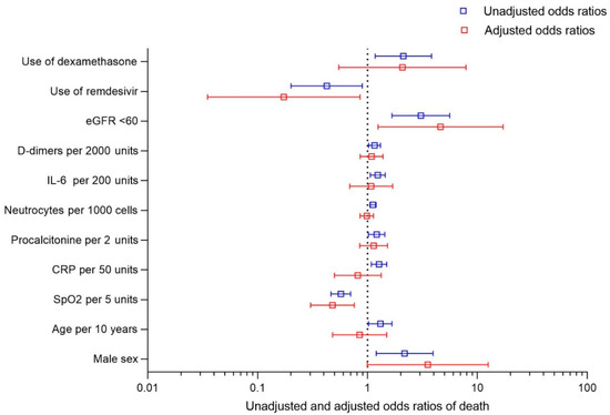 SpO2 at hospital admission and decreased remained crucial factors associated with odds of death. These data do not require an explanation as it reflects the severity of the disease course prior to hospitalization and/or preexisting comorbidities, particularly kidney insufficiency and respiratory failure. Both are well known and described in multiple studies. For example, Mamlouk O et al. found the overall mortality rate of cancer patients with CKD and COVID-19 was almost 1.7 times higher than the rate of patients with no CKD at the tertiary cancer center in Houston [21]. Additionally, in one of the studies from the SARSTER project, we were able to find that lower eGFR was a leading driving factor of mortality in the analysis of 2322 COVID-19 patients where a subject with eGFR < 30 mL/min had six-times higher mortality compared with those >60 mL/min [22].