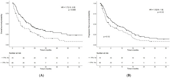 Overall survival (A) and progression-free survival (B), depending on PPI administration.
