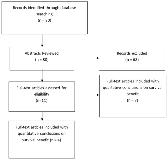 Due to the heterogeneity of studies, outcomes of interest if applicable were: overall survival (OS), progression-free survival (PFS), median survival, and survival at 1 and 5 years. Exclusion criteria included abstracts, case reports, manuscripts not in English, and articles that did not specify if the primary surgical intervention had been employed before chemotherapy.