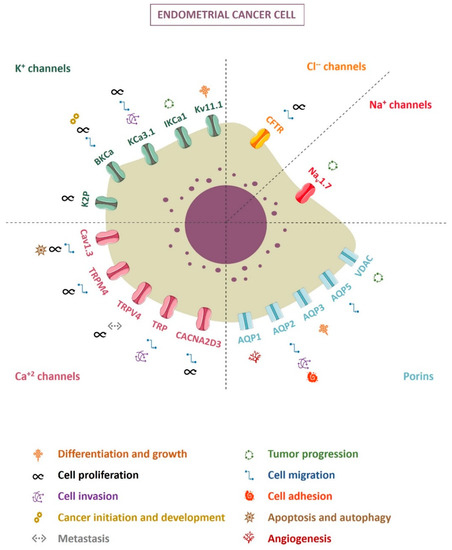 Cancer development involves proliferative signaling, resistance to growth suppressors and death, replicative immortality, angiogenesis, and activation of invasion and metastasis pathways [7]. Ion transport mechanisms are implicated in these cell functions by the modulation of ion flux across cell membranes, cell volume, signal transduction pathways, cellular transport [80], and homeostatic maintenance in subcellular organelles [81]. Ion channels’ and transporters’ dysregulation has been related to pathophysiologic processes, especially in epithelial cells [80]. Interestingly, epithelial tissue is the most common site for the development of cancers. Specifically, those epithelia with secretory capacities, such as the uterus, seem to be frequent sites of cancer [82].