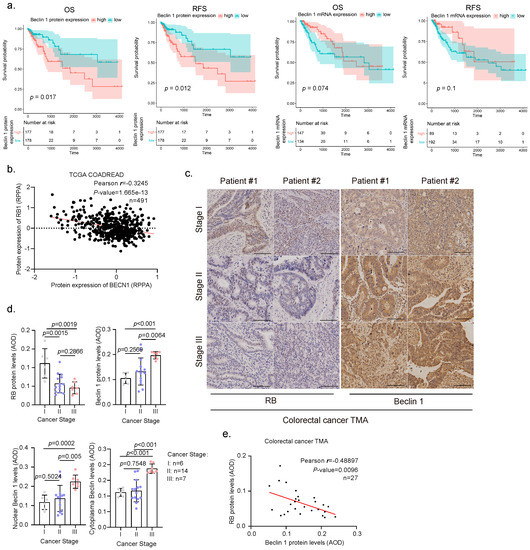 The tumor suppressor RB protein plays a pivotal role in the negative control of the cell cycle and tumor progression [23]. However, the clinic correlation between RB expression and human colorectal cancer remains controversial [24,25]. We therefore analyzed the current TCGA database for RB1 expression in human colorectal cancer. As shown in Supplementary Figure S1a, low expression of RB1 was associated with poor overall survival (OS) in human colorectal cancer patients. Furthermore, we found that high expression of Beclin 1 protein, but not mRNA, was associated with poor OS and relapse-free survival (RFS) in CRC patients (Figure 1a). To investigate the correlation between RB and Beclin 1, we then analyzed the correlation between Beclin 1 and RB protein expression of colorectal cancer patients in the TCGA-COADREAD dataset obtained from LinkedOmics [22]. Our analyses reveal a moderate negative correlation (r = −0.3245, Pearson’s correlation coefficient) between RB and Beclin 1 proteins (revised Figure 1b) in contrast to mRNA levels that showed a weak positive correlation (data from cBioPortal [19,20], GDC TCGA COAD [26], and GEPIA [21]) (Figure 1b and Supplementary Figure S1b–d). We further examined the correlation of RB and Beclin 1 protein expression using the human colorectal cancer tissue microarrays (TMA) consisting of colorectal cancer specimens at different clinical stages. As shown in Figure 1c–e, reduced RB protein expression and increased Beclin 1 expression were observed in human colorectal cancer specimens at stages II and III compared with the specimens at stage I. Notably, the expression of Beclin 1 protein was dramatically increased in the nucleus and was negatively correlated with RB protein expression.