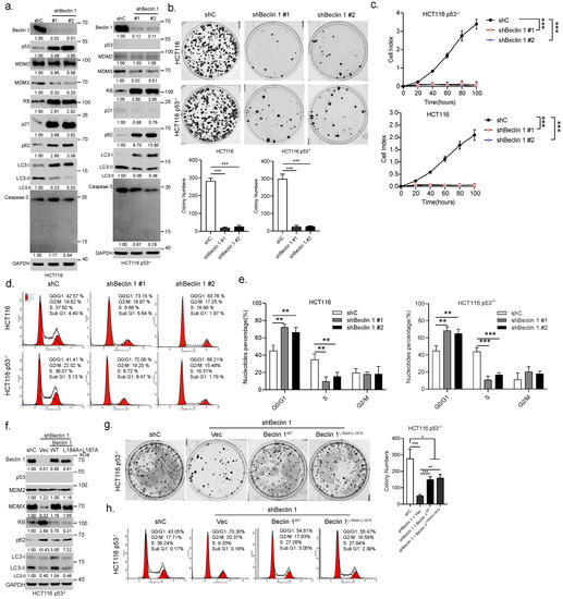 Ablation of BECN1 leads to cell cycle G1/S arrest and growth inhibition through upregulation of RB protein expression. HCT116 or HCT116 p53 cells stably expressing shRNA specific for BECN1 (#1 or #2) or control shRNA (shC) were subjected to western blot (a), colony formation assays (b), real-time cell analyses (RTCA) (c), and FACS analyses (d). Quantifications of cell cycle derived from FACS analyses (e). HCT116 p53 cells stably expressing shBeclin 1 were infected with lentivirus expressing Beclin 1 or Beclin 1 followed by western blot (f), colony formation assays (g), and FACS analyses (h). Data derived from three independent experiments were presented as mean ± SD. * p < 0.05, ** p < 0.01, *** p < 0.001. The uncropped blots and molecular weight markers are shown in Supplementary File S1.
