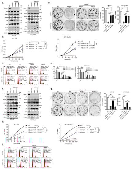 Ablation of BECN1 reduces MDMX expression resulting in the RB-dependent cell cycle G1/S arrest and growth inhibition. HCT116 or HCT116 p53 cells stably expressing shBeclin 1 were infected with lentivirus shRNA specific for RB1 (#1 or #2) or control shRNA and subjected to western blot (a), colony formation assays (b), real-time cell analyses (RTCA) (c), and FACS analyses (d). Quantifications of cell cycle derived from FACS analyses (e). HCT116 or HCT116 p53 cells stably expressing shBeclin 1 were infected with lentivirus expressing MDMX or MDMX and subjected to western blot (f), colony formation assays (g), real-time cell analyses (RTCA) (h), and FACS analyses (i). Data were derived from three independent experiments and were presented as mean ± SD. * p < 0.05, ** p < 0.01, *** p < 0.001. The uncropped blots and molecular weight markers are shown in Supplementary File S1.