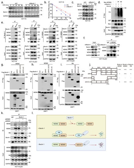 Ablation of BECN1 facilities MDM2–MDMX interaction to promote MDMX degradation and RB protein stabilization. (a) HCT116 cells stably expressing shBeclin 1 or control shRNA (shC) were treated with 50 μg/mL cycloheximide (CHX) for the indicated time intervals. (b) The plots of RB protein half-life. (c) HCT116 cells stably expressing shBeclin 1 or control shRNA (shC) were treated with 20 M MG132 for 12 h before collection. Total cell lysates were subjected to western blot. (d) 293FT cells stably expressing shC or shBeclin 1 (#1 or #2) were transfected with expressing plasmids of Myc-MDMX, His-Ub. Then, cells were treated with 20 M MG132 for 6 h before collection. Ubiquitylation of MDMX was examined by IP-western analyses. (e) HCT116 or HCT116 p53 cells were subjected to co-immunoprecipitation (co-IP) using either a specific antibody for Beclin 1 and MDMX or IgG control followed by western blot analyses. (f) HCT116 p53 cells stably expressing shC or shBeclin 1 were subjected to co-immunoprecipitation (co-IP) assay using a specific antibody for MDM2 or IgG control followed by western blot analyses as indicated. (g–j) 293FT cells were co-transfected with Flag-Beclin 1 (FL) or an indicated Beclin 1 deletion construct and MDM2 (g), MDMX (h), or RB (i). Total cell lysates were subjected to IP-western analyses. (j) A schematic illustration shows MDM2–Beclin 1, MDMX–Beclin 1, and RB–Beclin 1 interaction domains. (k) HCT116 p53 cells transfected with siMDM2, siMDMX, siMDM2/siMDMX were subjected to co-immunoprecipitation (co-IP) using a specific antibody followed by western blot analyses as indicated. (l) A sketch depicts a model of the influence of Beclin 1 on quadruple protein complexes formation among Beclin 1, RB, MDMX, and MDM2. The uncropped blots and molecular weight markers are shown in Supplementary File S1.