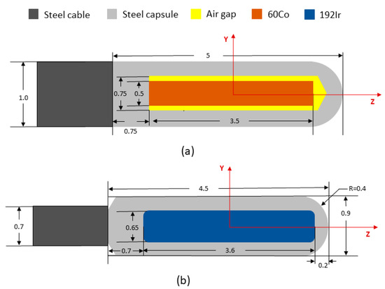 Reference coordinate system and schematic diagram of the model for 60Co and 192Ir. Dimensions are in millimeters. (a) E&Z Bebig HDR 60Co model Co0.A86 source; (b) Nucletron HDR 192Ir model mHDR-v2r.